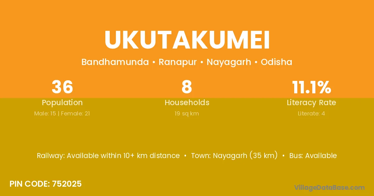 Nayagarh (35 km) is the nearest town to Ukutakumei village for major economic activities and is located approximately 35 km away.