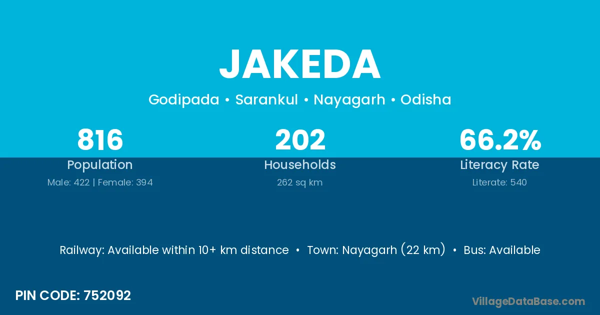 Nayagarh (22 km) is the nearest town to Jakeda village for major economic activities and is located approximately 22 km away.
