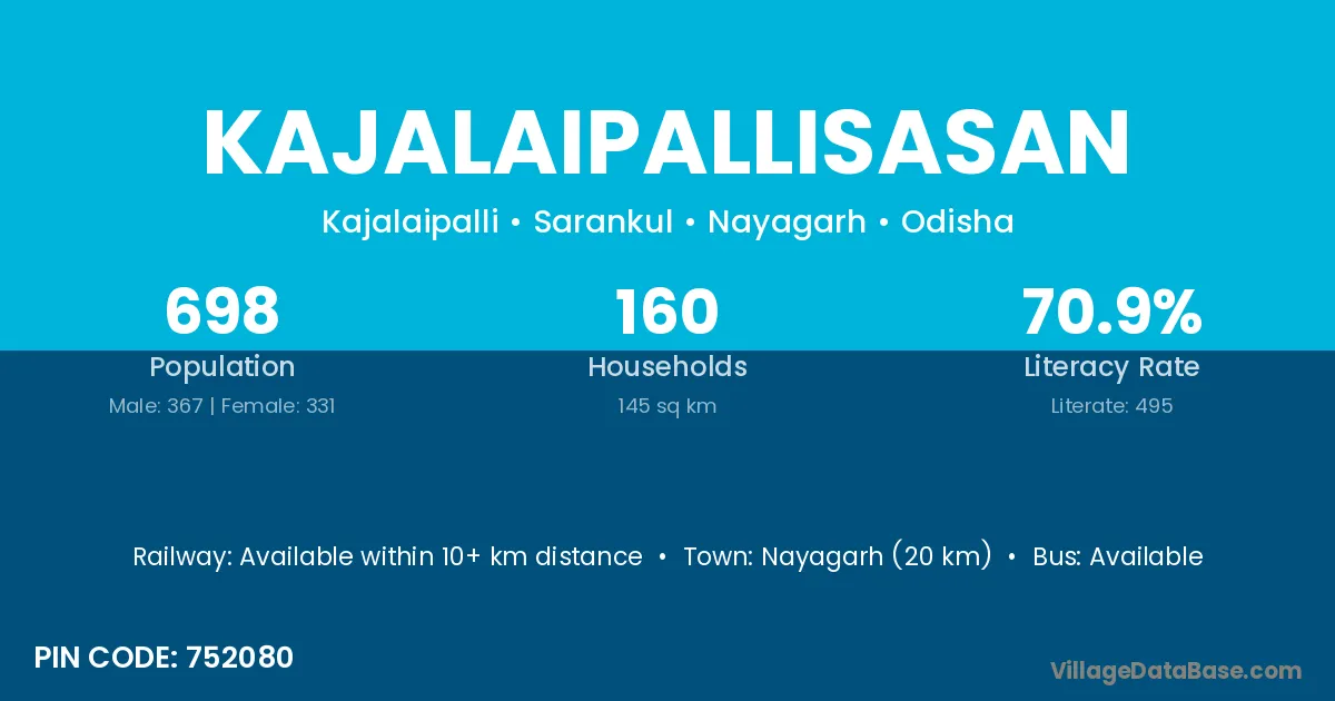 Nayagarh (20 km) is the nearest town to Kajalaipallisasan village for major economic activities and is located approximately 20 km away.