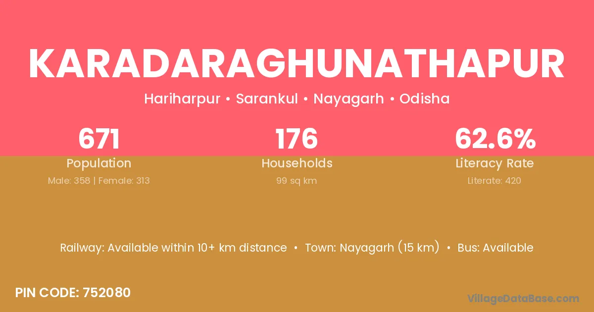 Nayagarh (15 km) is the nearest town to Karadaraghunathapur village for major economic activities and is located approximately 15 km away.