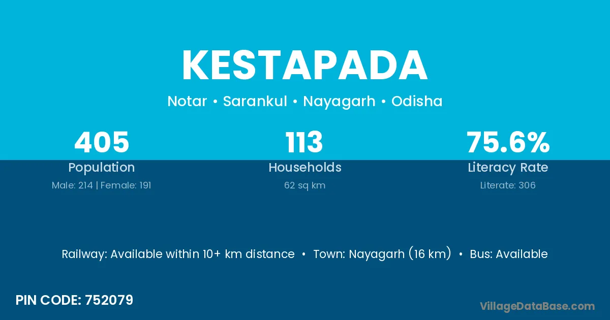 Nayagarh (16 km) is the nearest town to Kestapada village for major economic activities and is located approximately 16 km away.