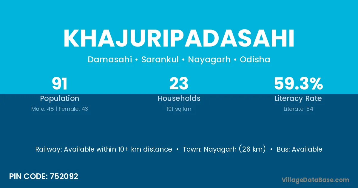 Nayagarh (26 km) is the nearest town to Khajuripadasahi village for major economic activities and is located approximately 26 km away.