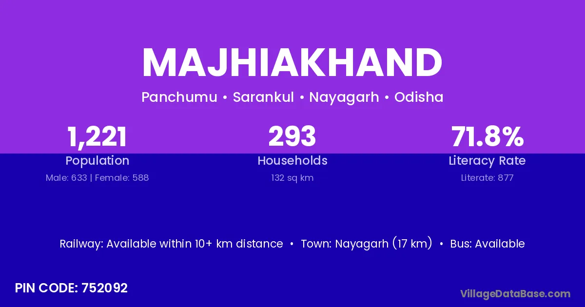 Nayagarh (17 km) is the nearest town to Majhiakhand village for major economic activities and is located approximately 17 km away.