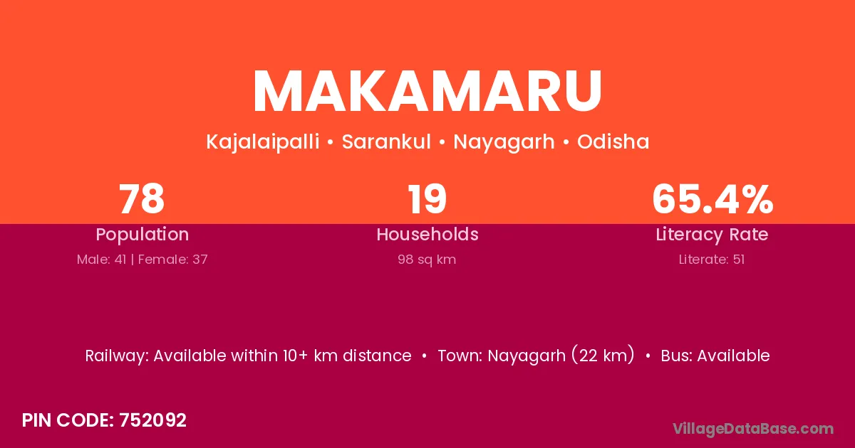 Nayagarh (22 km) is the nearest town to Makamaru village for major economic activities and is located approximately 22 km away.