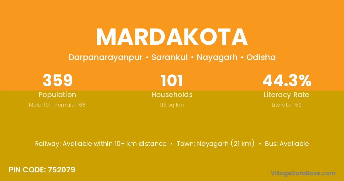 Nayagarh (21 km) is the nearest town to Mardakota village for major economic activities and is located approximately 21 km away.