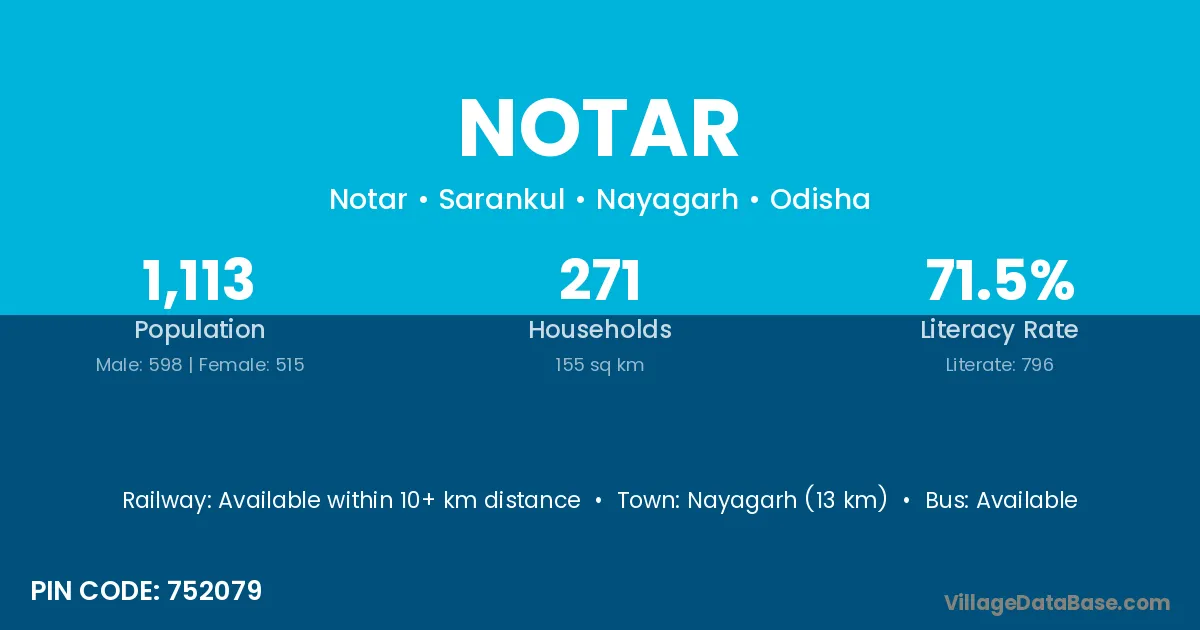 Nayagarh (13 km) is the nearest town to Notar village for major economic activities and is located approximately 13 km away.