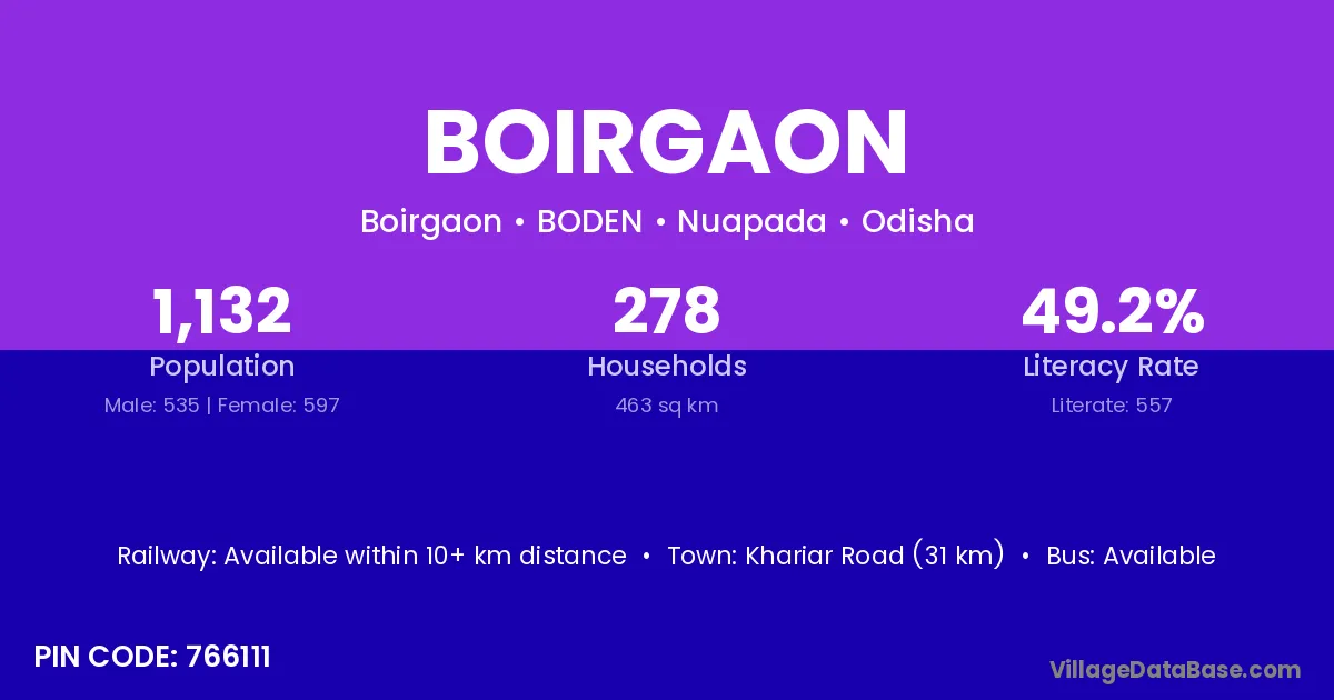 Khariar Road (31 km) is the nearest town to Boirgaon village for major economic activities and is located approximately 31 km away.