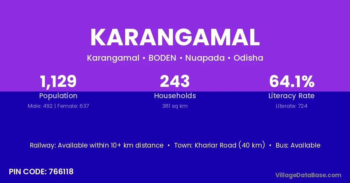 Khariar Road (40 km) is the nearest town to Karangamal village for major economic activities and is located approximately 40 km away.