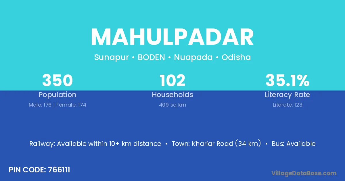 Khariar Road (34 km) is the nearest town to Mahulpadar village for major economic activities and is located approximately 34 km away.