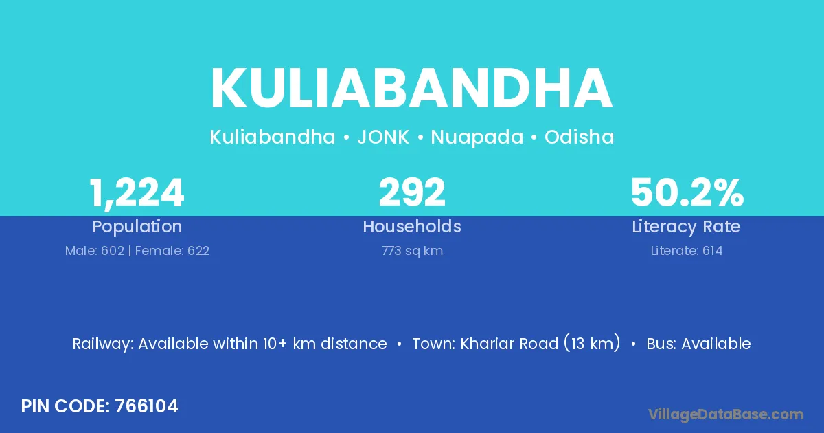 Khariar Road (13 km) is the nearest town to Kuliabandha village for major economic activities and is located approximately 13 km away.