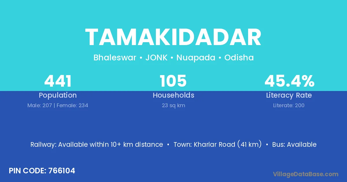 Khariar Road (41 km) is the nearest town to Tamakidadar village for major economic activities and is located approximately 41 km away.