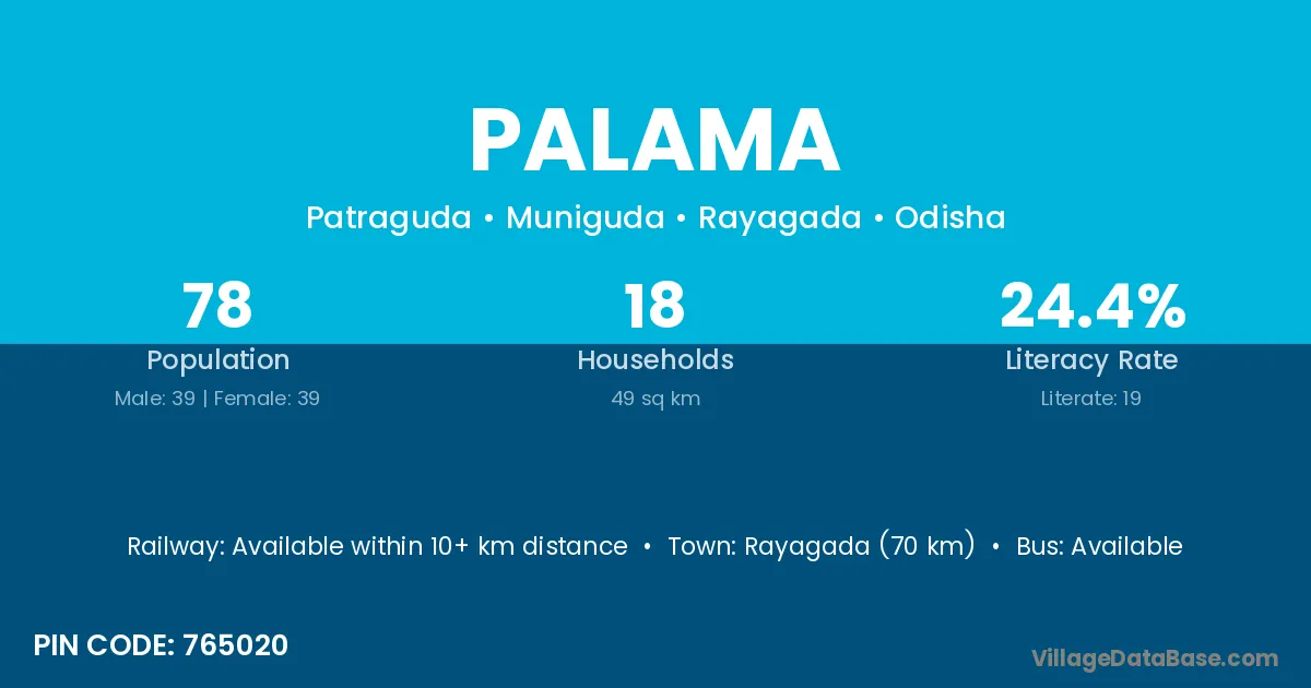 Khariar Road (20 km) is the nearest town to Palama village for major economic activities and is located approximately 20 km away.
