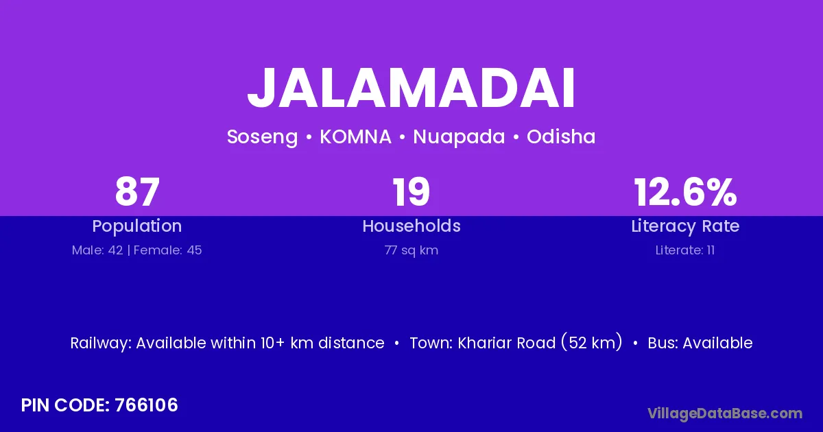 Khariar Road (52 km) is the nearest town to Jalamadai village for major economic activities and is located approximately 52 km away.