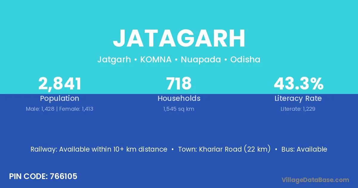 Khariar Road (22 km) is the nearest town to Jatagarh village for major economic activities and is located approximately 22 km away.