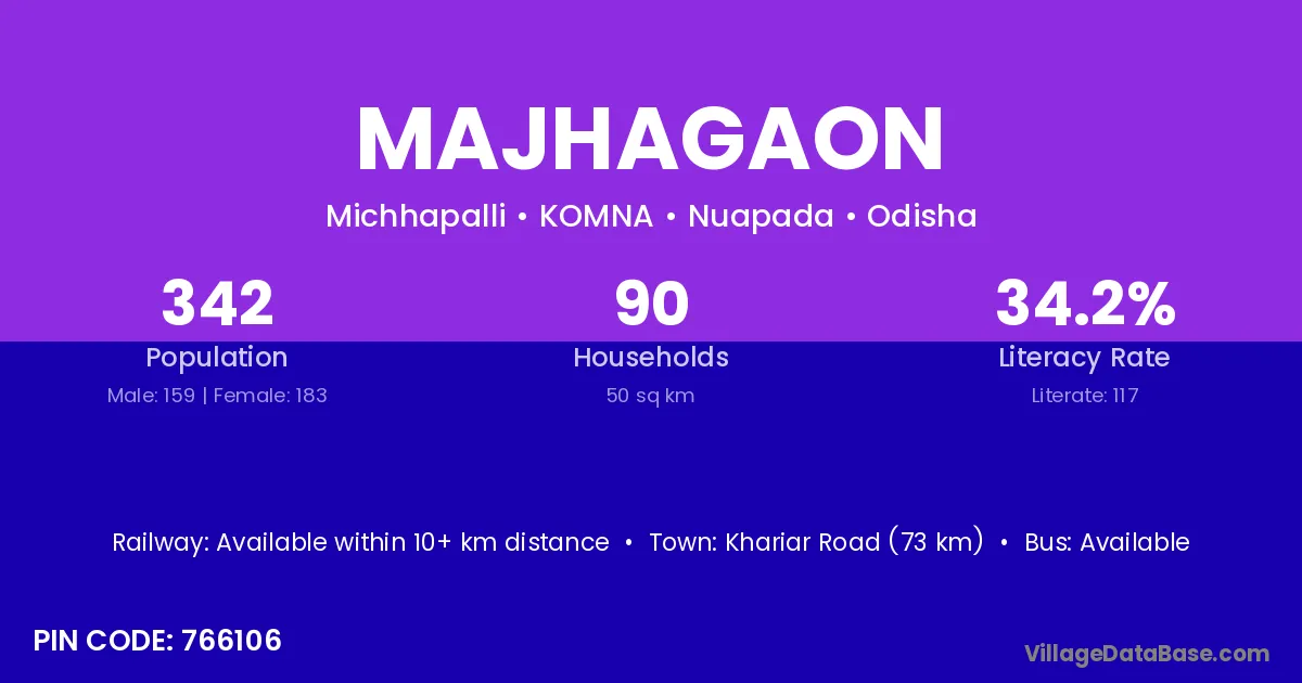Khariar Road (73 km) is the nearest town to Majhagaon village for major economic activities and is located approximately 73 km away.