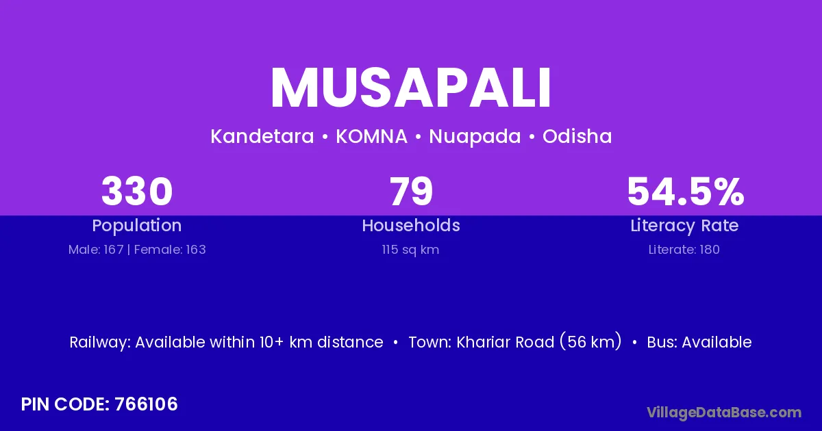 Khariar Road (56 km) is the nearest town to Musapali village for major economic activities and is located approximately 56 km away.