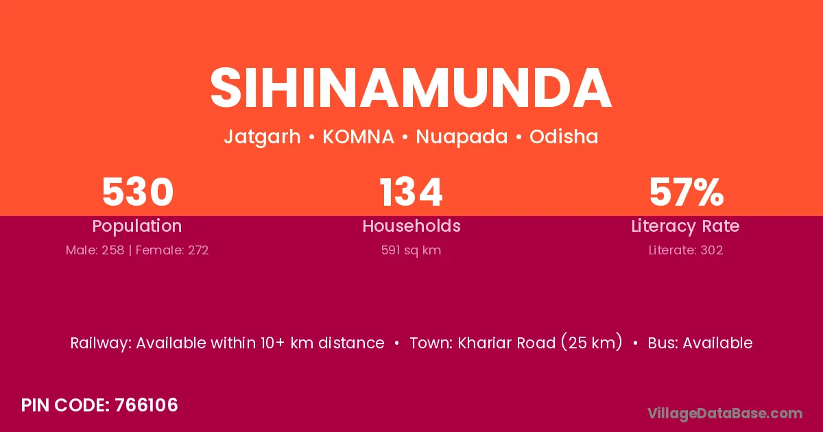 Khariar Road (25 km) is the nearest town to Sihinamunda village for major economic activities and is located approximately 25 km away.