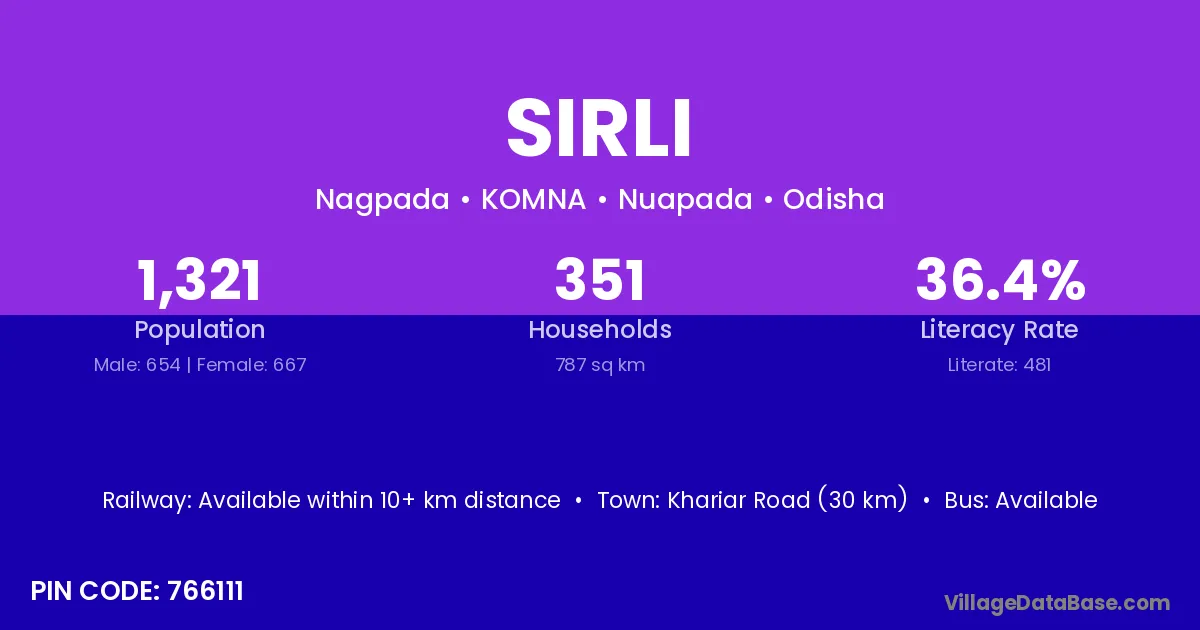 Khariar Road (30 km) is the nearest town to Sirli village for major economic activities and is located approximately 30 km away.