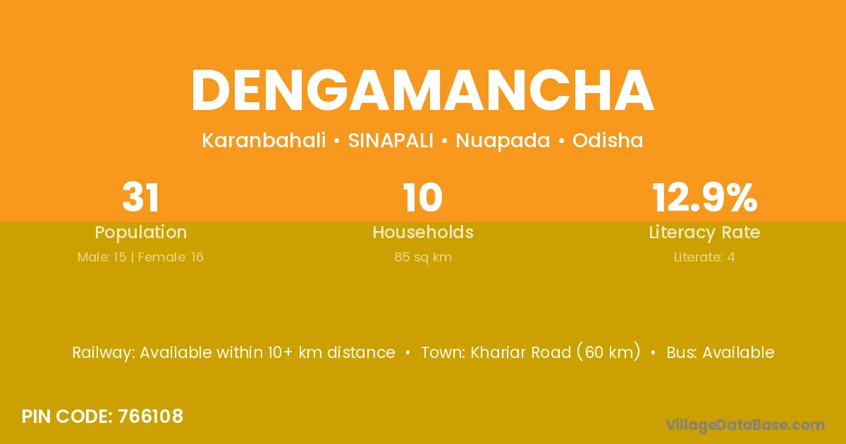 Khariar Road (60 km) is the nearest town to Dengamancha village for major economic activities and is located approximately 60 km away.