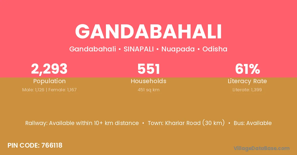Khariar Road (30 km) is the nearest town to Gandabahali village for major economic activities and is located approximately 30 km away.