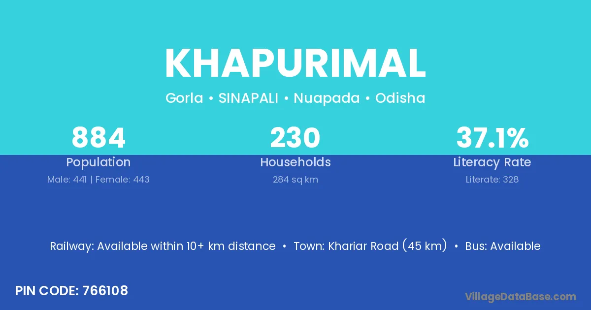 Khariar Road (45 km) is the nearest town to Khapurimal village for major economic activities and is located approximately 45 km away.