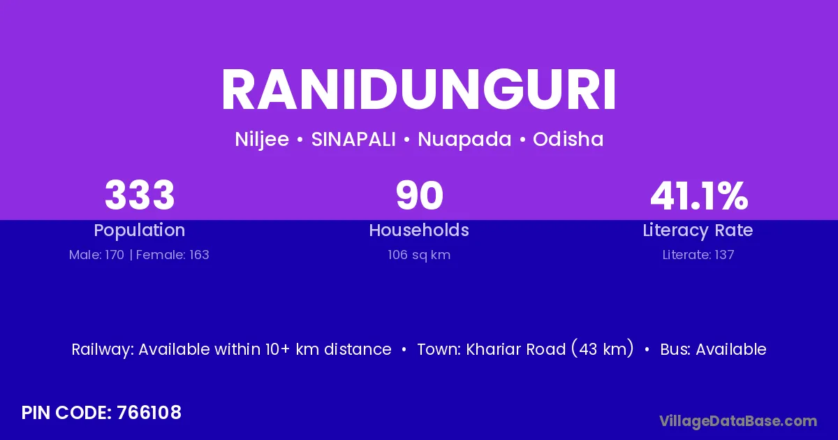 Khariar Road (43 km) is the nearest town to Ranidunguri village for major economic activities and is located approximately 43 km away.
