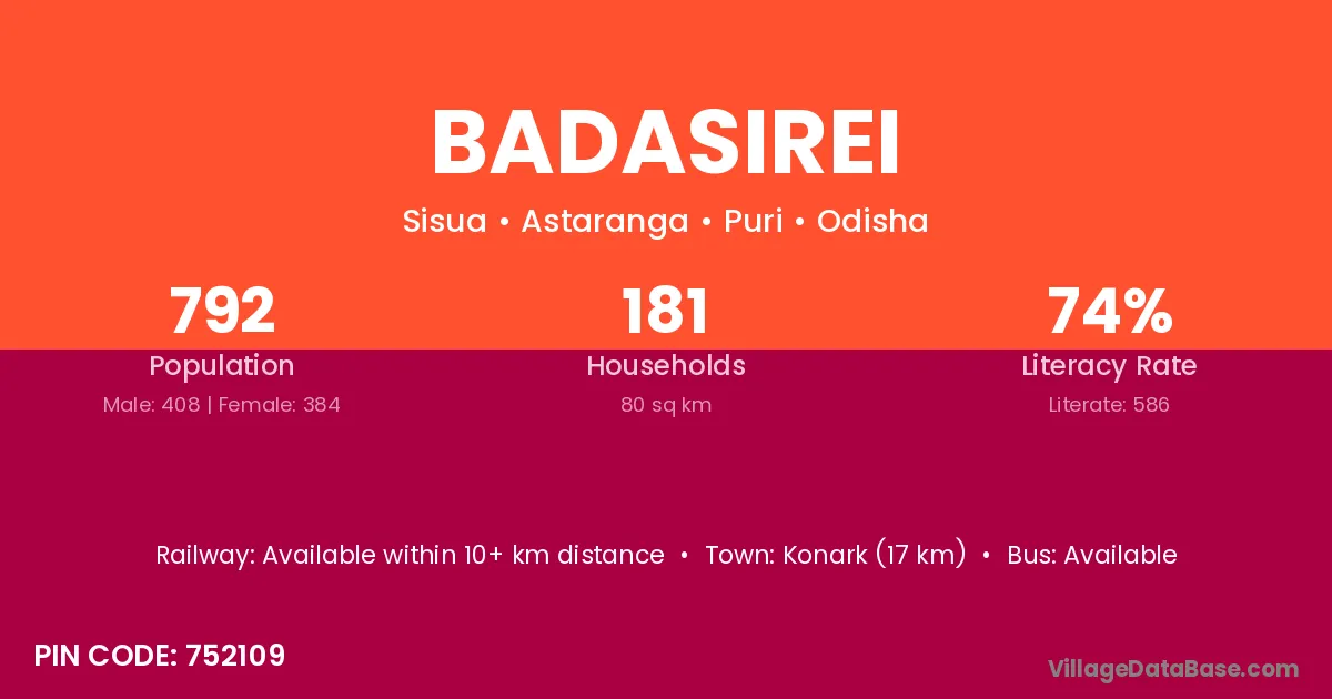 Konark (17 km) is the nearest town to Badasirei village for major economic activities and is located approximately 17 km away.