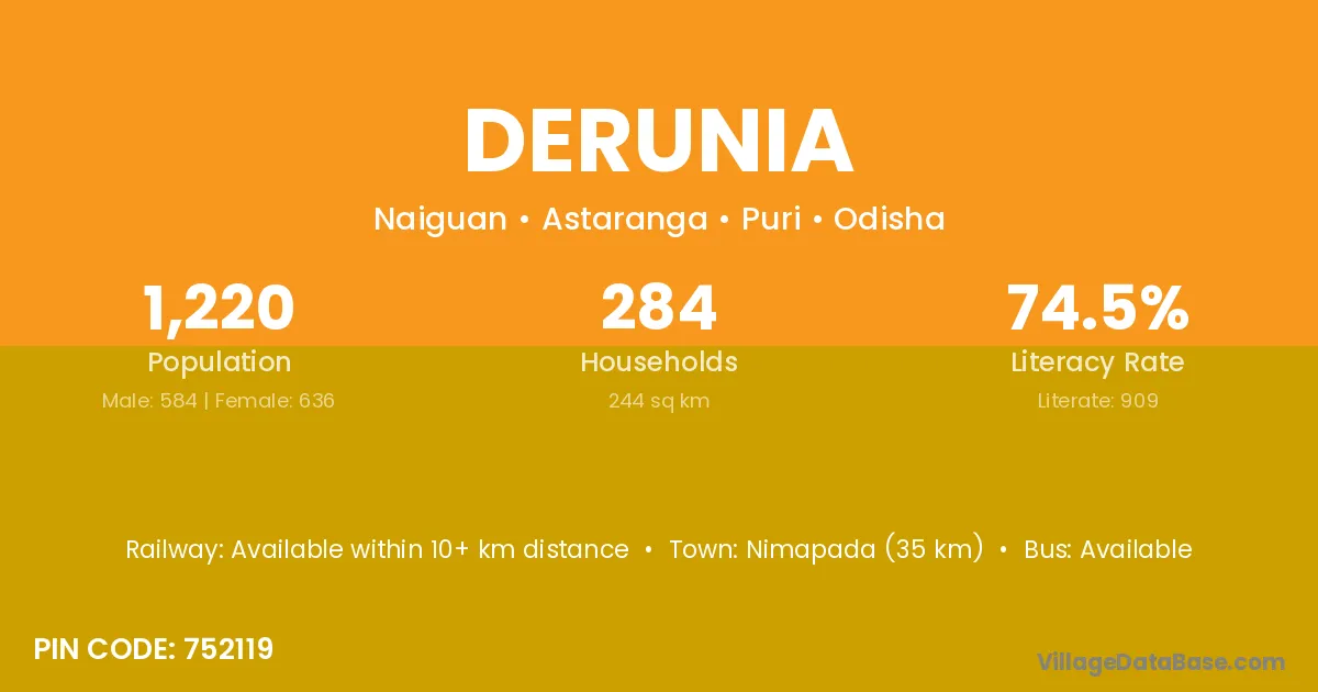 Derunia village has a total population of 1,220 people, of which 584 are males and 636 are females.