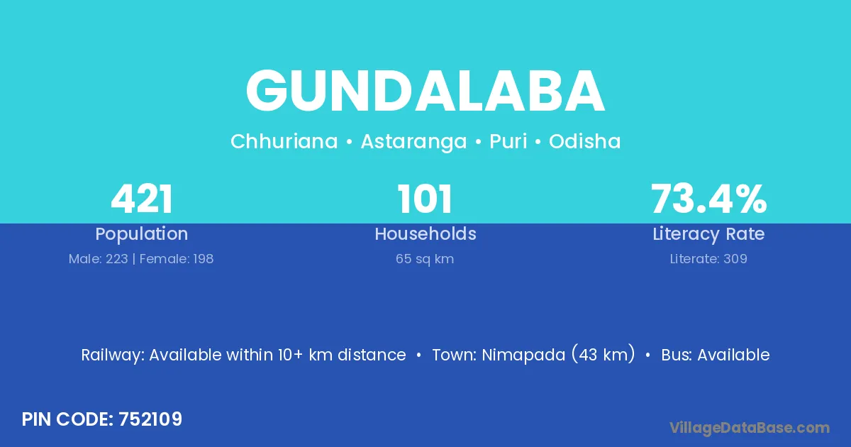 Nimapada (43 km) is the nearest town to Gundalaba village for major economic activities and is located approximately 43 km away.