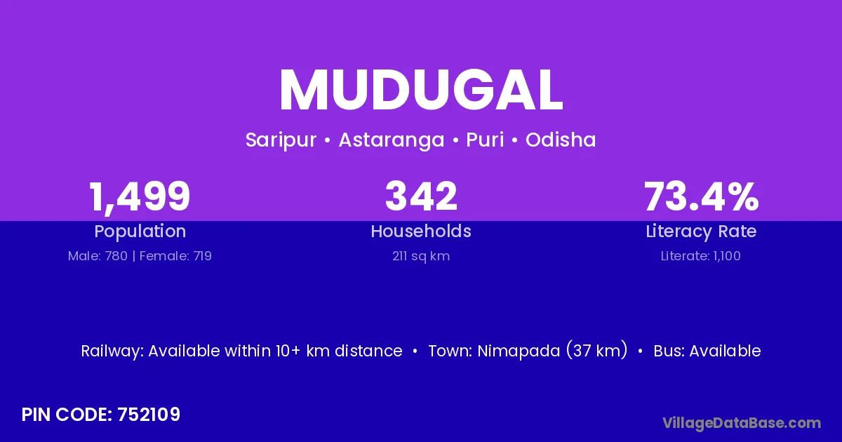 Nimapada (37 km) is the nearest town to Mudugal village for major economic activities and is located approximately 37 km away.