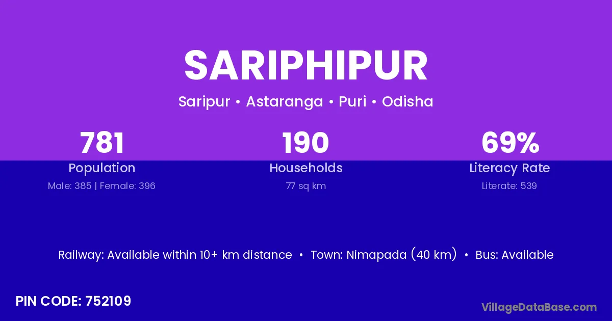 Nimapada (40 km) is the nearest town to Sariphipur village for major economic activities and is located approximately 40 km away.