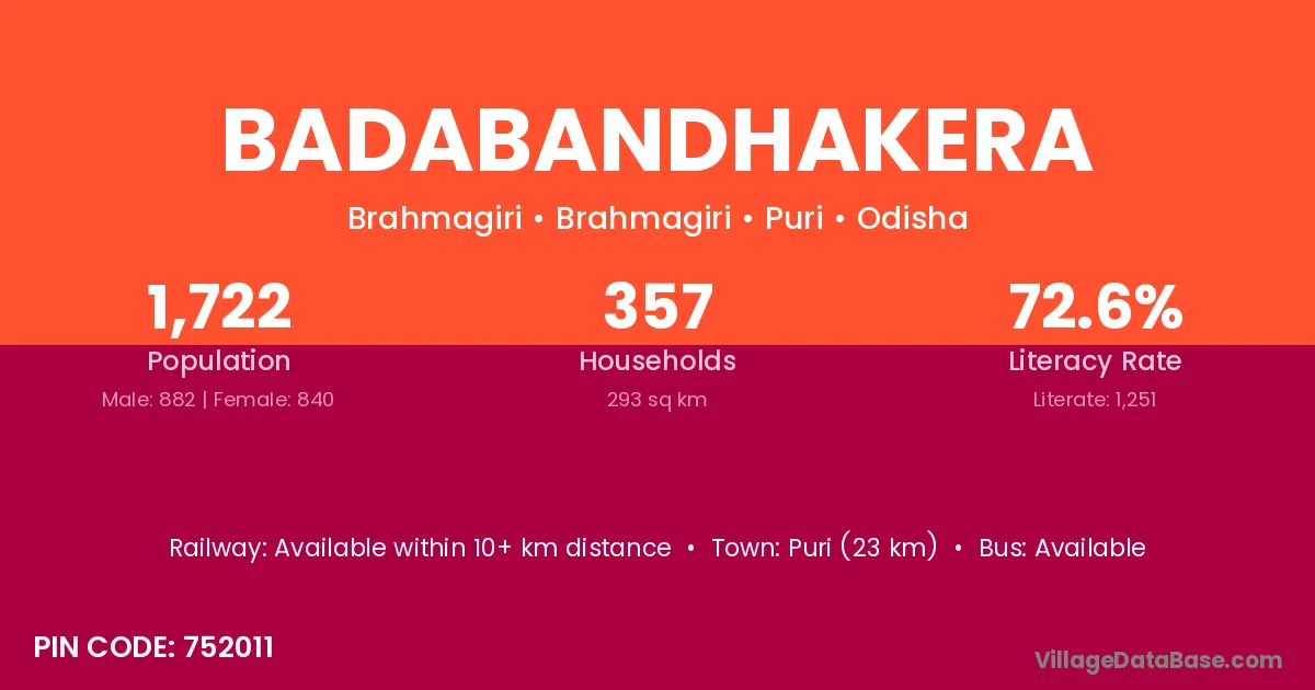 Puri (23 km) is the nearest town to Badabandhakera village for major economic activities and is located approximately 23 km away.