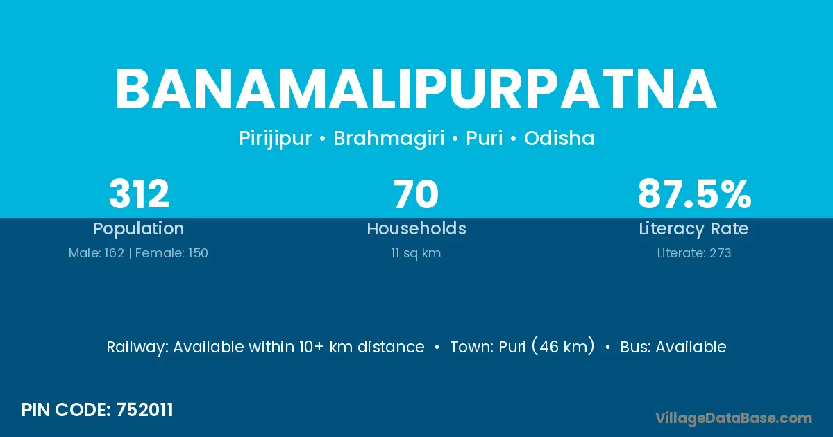 Puri (46 km) is the nearest town to Banamalipurpatna village for major economic activities and is located approximately 46 km away.