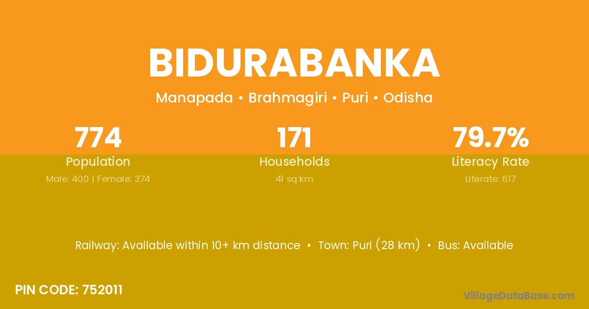 Puri (28 km) is the nearest town to Bidurabanka village for major economic activities and is located approximately 28 km away.