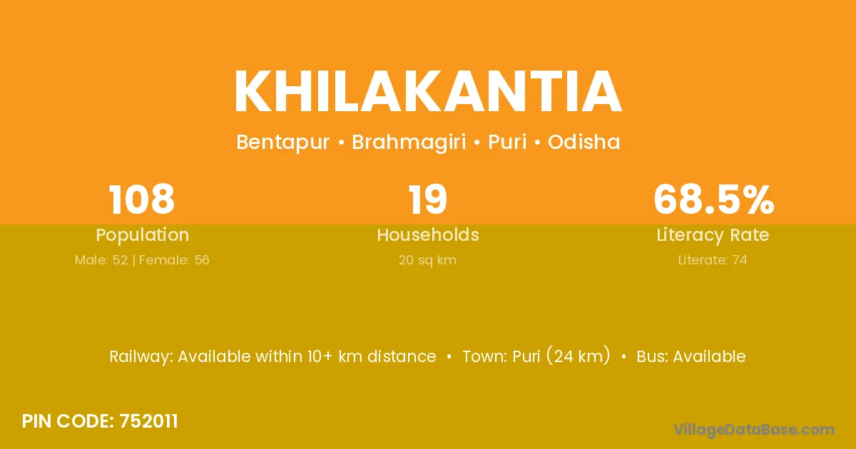 Puri (24 km) is the nearest town to Khilakantia village for major economic activities and is located approximately 24 km away.