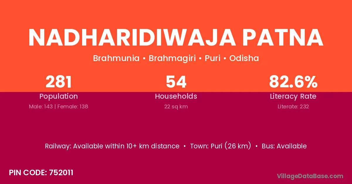 Puri (26 km) is the nearest town to Nadharidiwaja Patna village for major economic activities and is located approximately 26 km away.