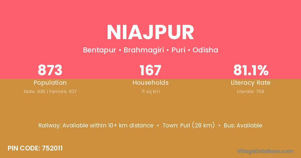 Puri (28 km) is the nearest town to Niajpur village for major economic activities and is located approximately 28 km away.