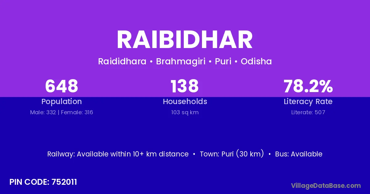 Puri (30 km) is the nearest town to Raibidhar village for major economic activities and is located approximately 30 km away.