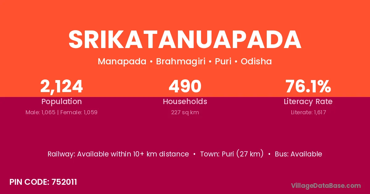 Puri (27 km) is the nearest town to Srikatanuapada village for major economic activities and is located approximately 27 km away.