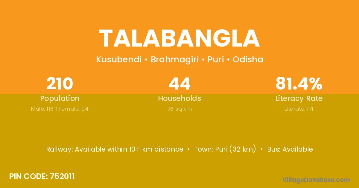 Puri (32 km) is the nearest town to Talabangla village for major economic activities and is located approximately 32 km away.