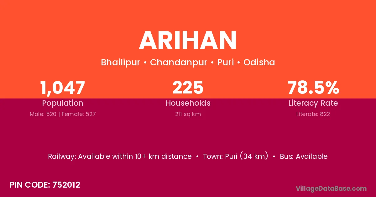 Puri (34 km) is the nearest town to Arihan village for major economic activities and is located approximately 34 km away.
