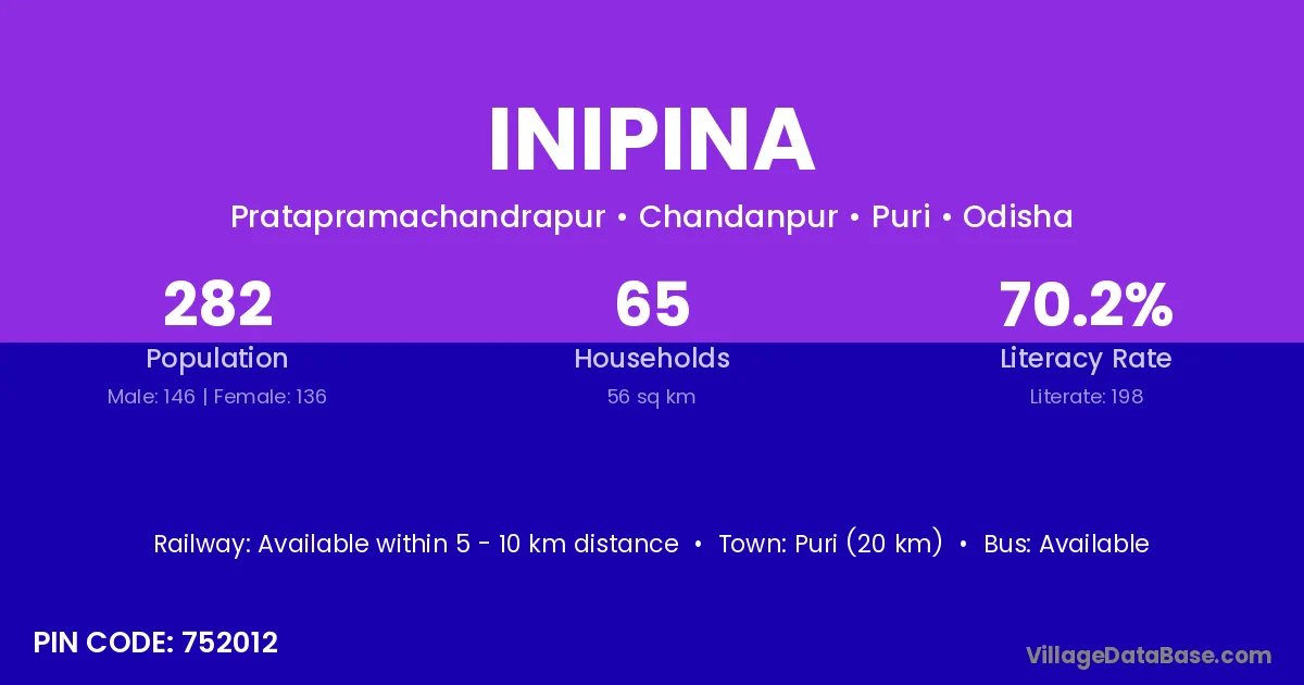 Puri (20 km) is the nearest town to Inipina village for major economic activities and is located approximately 20 km away.