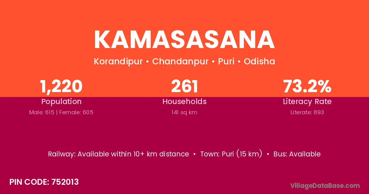 Puri (15 km) is the nearest town to Kamasasana village for major economic activities and is located approximately 15 km away.