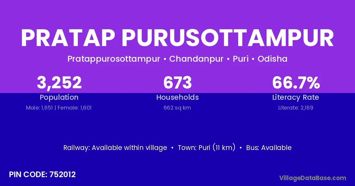 Puri (11 km) is the nearest town to Pratap Purusottampur village for major economic activities and is located approximately 11 km away.