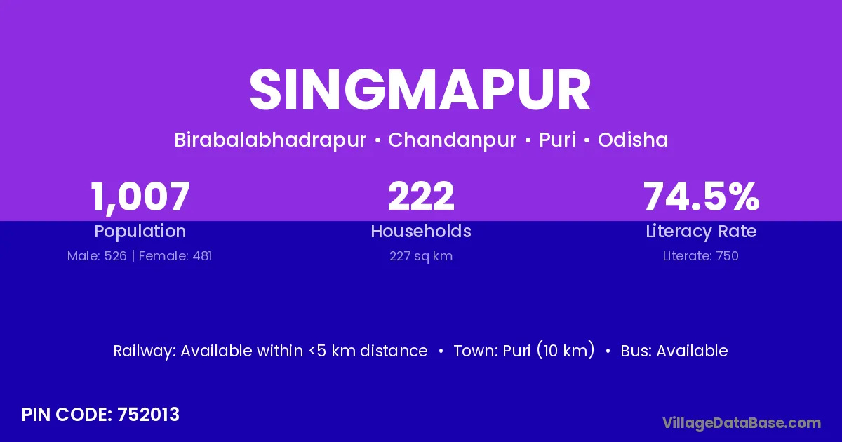 Puri (10 km) is the nearest town to Singmapur village for major economic activities and is located approximately 10 km away.