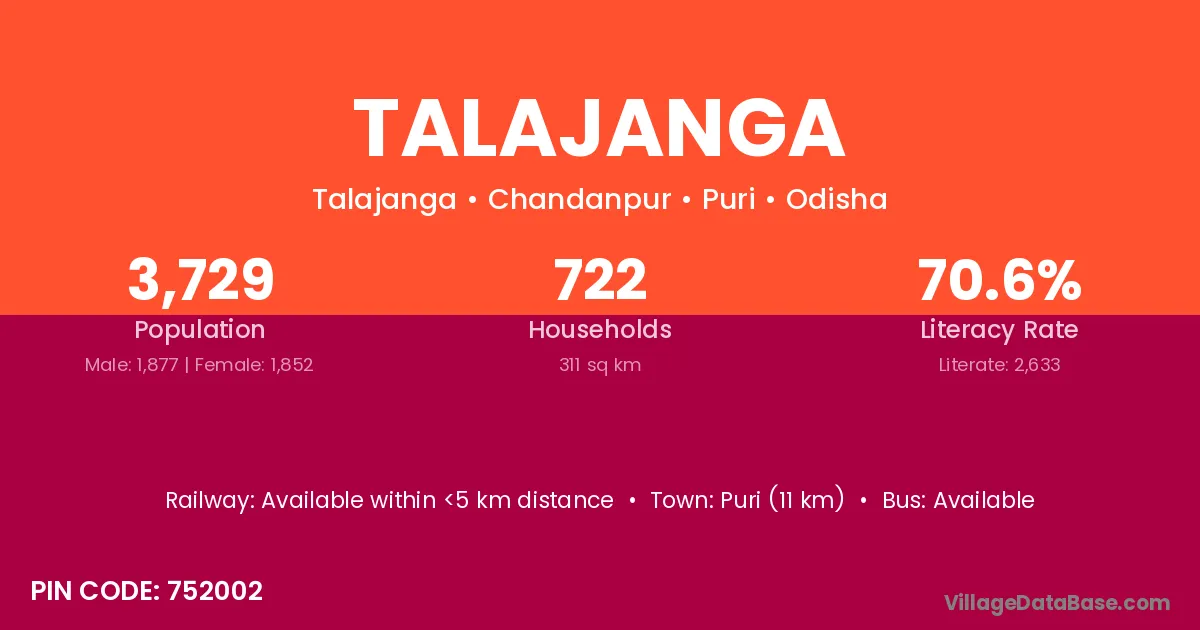 Puri (11 km) is the nearest town to Talajanga village for major economic activities and is located approximately 11 km away.