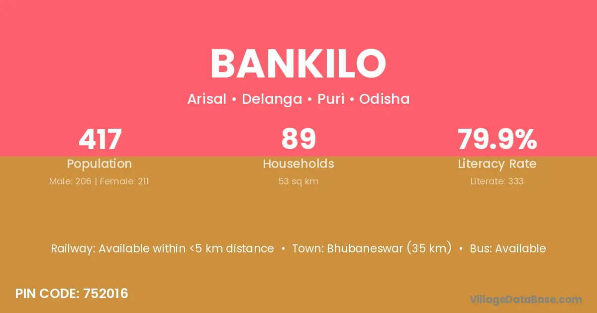 Bhubaneswar (35 km) is the nearest town to Bankilo village for major economic activities and is located approximately 35 km away.
