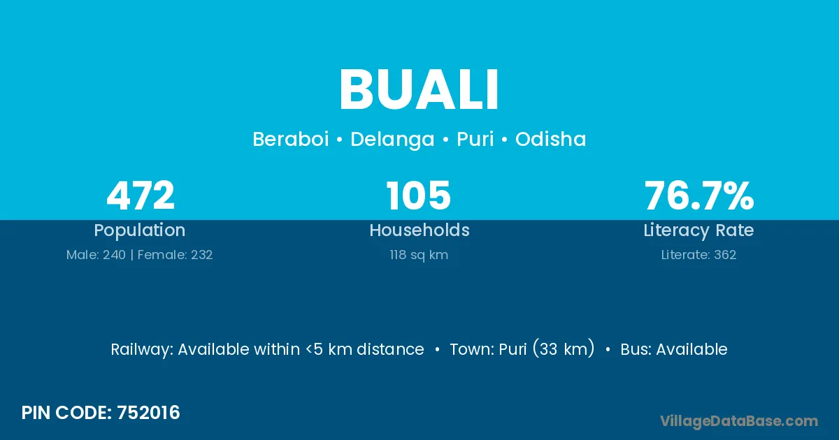 Puri (33 km) is the nearest town to Buali village for major economic activities and is located approximately 33 km away.