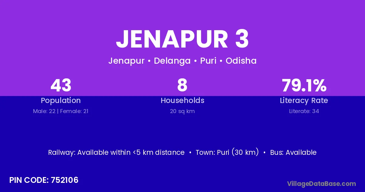 Puri (30 km) is the nearest town to Jenapur 3 village for major economic activities and is located approximately 30 km away.