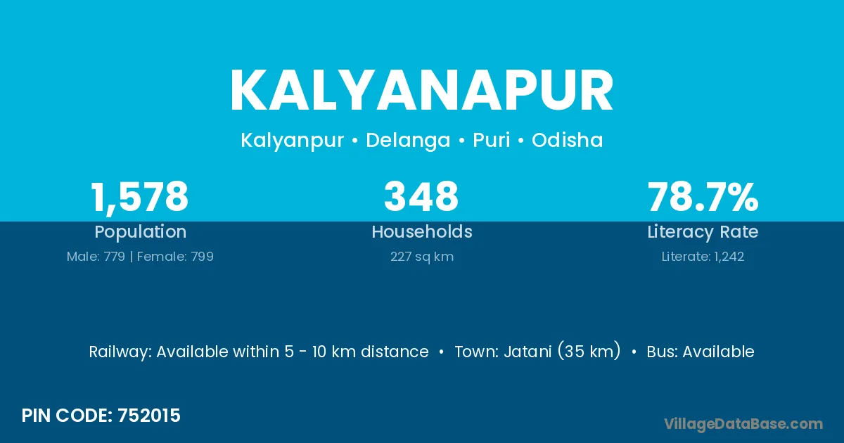 Jatani (35 km) is the nearest town to Kalyanapur village for major economic activities and is located approximately 35 km away.